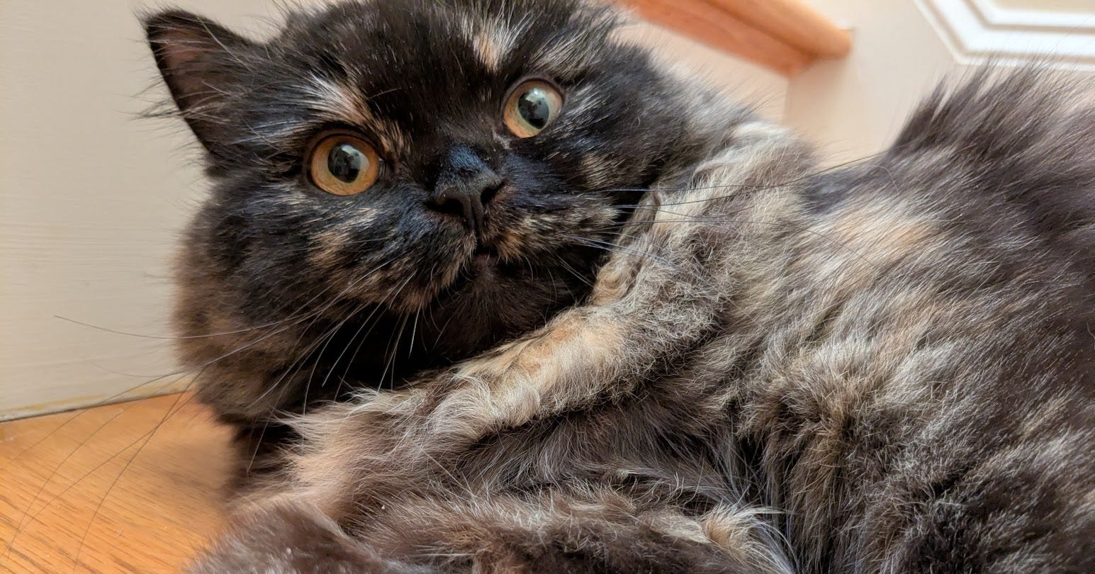 My Dad died in August of 2024, and for the first Father’s Day without him, in 2025, I decided it was time to welcome a cat into our family. My Dad always had a Persian cat when I was a kid. After I moved out and went to college, my parents got a Persian with points (Himalayan) named Gizmo. I came to see her every chance I got, but I wondered if she loved me back, or even remembered me. So I decided to teach her tricks. If she learned the trick on one trip home and still remembered it the next trip, then I knew she remembered at least something about me. To my delight, it worked!