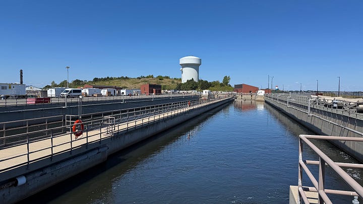 The plant’s architecture is breathtaking. The twelve egg-shaped anaerobic digesters, each 90 feet in diameter and 110 feet tall, dominate the skyline and hold 3 million gallons apiece. These structures alone cost hundreds of millions to construct and require constant monitoring to maintain optimal conditions for breaking down organic matter and producing methane that powers 20% of the plant. Yet much of the inspection work is still done by humans, who climb into confined spaces, work in hazardous environments, and manually check equipment. Our tour guides explained the costly process of emptying a digester of sludge and refilling it with water. People enter on rafts to inspect and clean the inside. (We were asked repeatedly to avoid using flushable wipes. Flushable wipes are not flushable!)